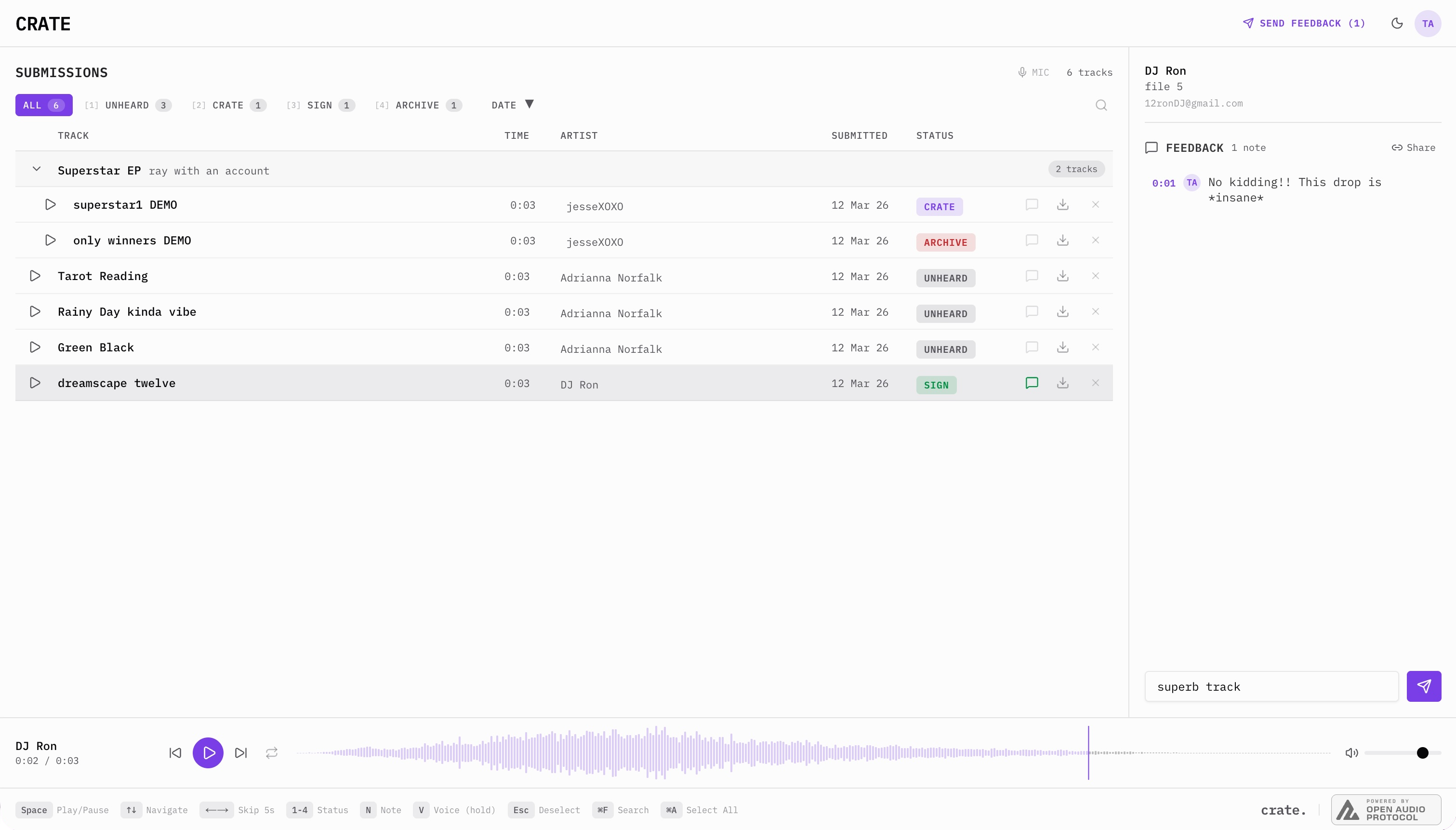 Designed by the Audius team, Crate is a purpose-built A&R workspace that transforms demo submission and review into a structured, high-signal workflow.